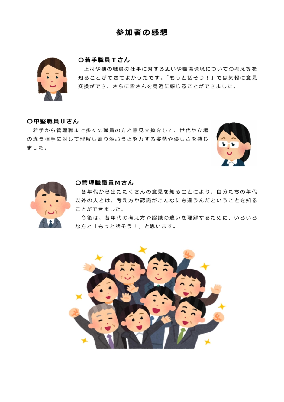 男女共同参画推進委員会の取組の一つとして、「もっと話そう!」と題し、若手職員、中堅職員、管理職職員それぞれがお互いに伝えたいことや聞いてみたいことを意見交換しました。