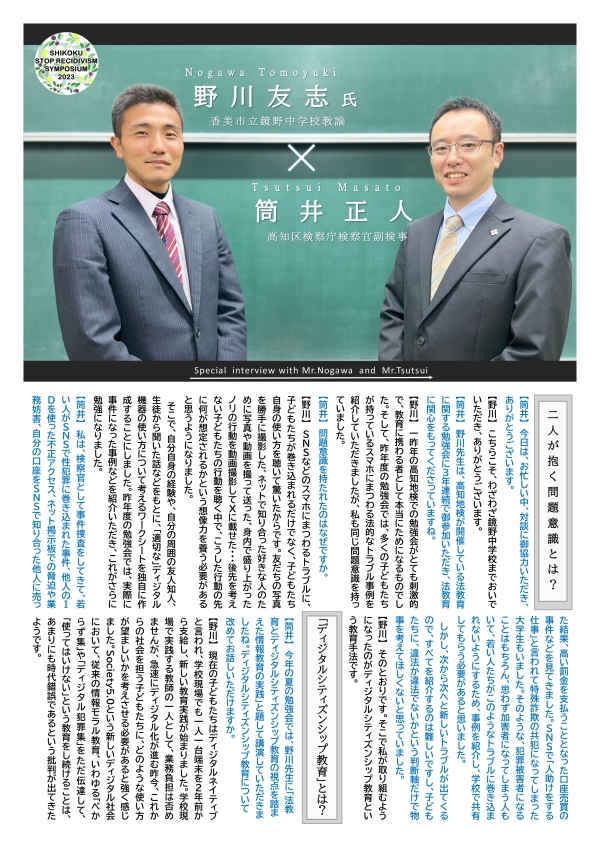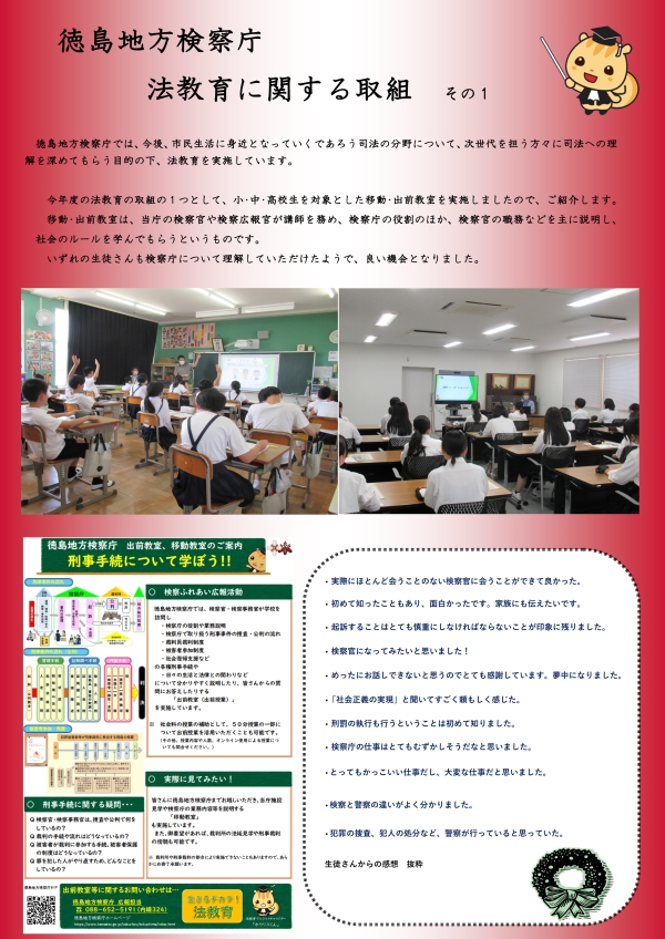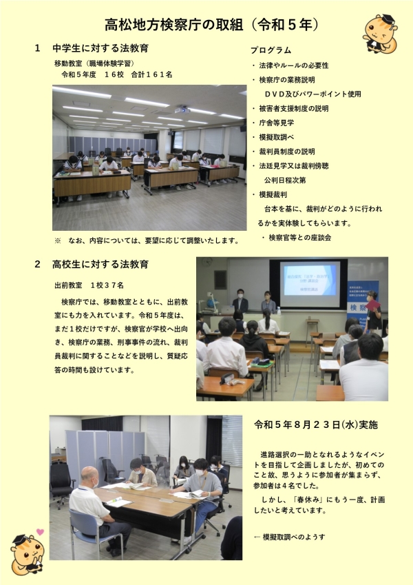 検察庁では、法的なものの考え方を身につけるための「法教育」をテーマとしたブースを設置します。四国各地の地方検察庁では、小、中、高校生や大学生を対象とした法教育の取組も積極的に行っています。こうした模様もパネル展示として紹介しますので、再犯防止を目的としたシンポジウムとともに法教育の重要性も関連付けてご覧いただければと考えています。