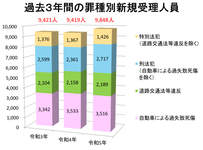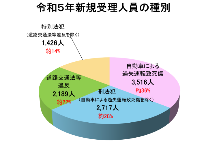 受理人員の総数は9,848人となっており、そのうち刑法犯(自動車による過失致死傷を除く)は、2,717人(約28%)です。