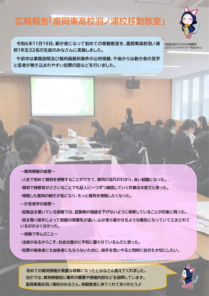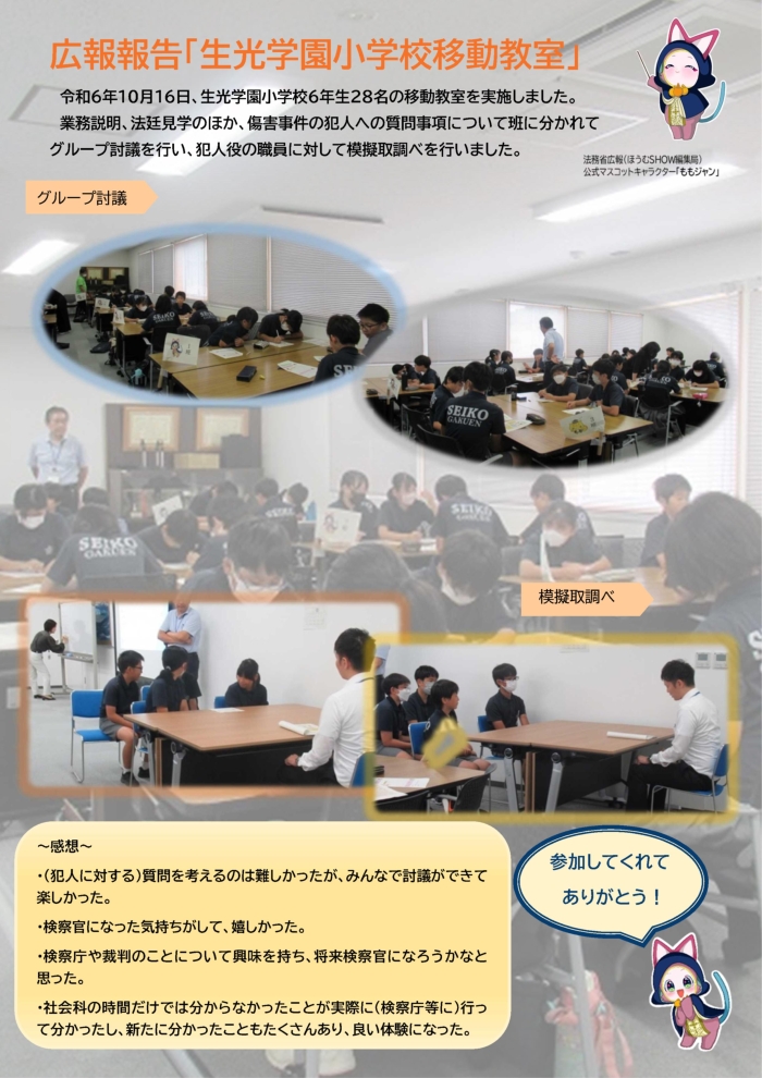 また、御要望があれば、裁判所において法廷見学や刑事裁判を傍聴することも可能です(ただし、裁判所や公判の都合により実施できないこともありますので、あらかじめ御了承願います。)。