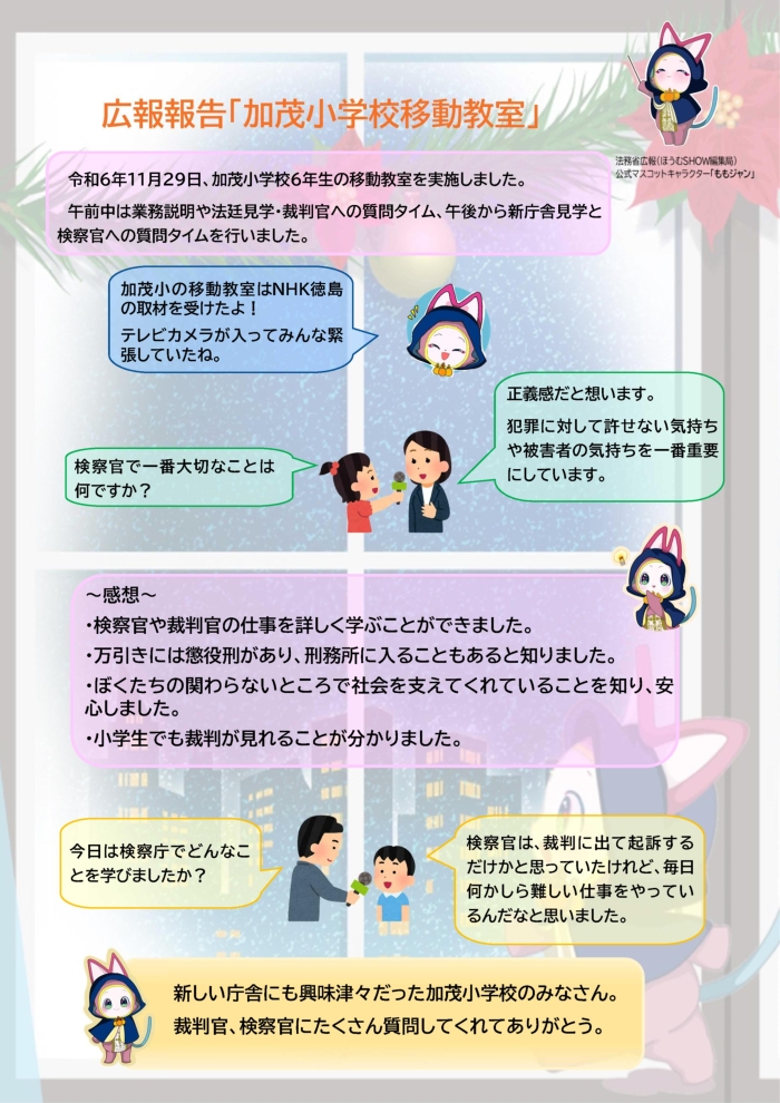 徳島地方検察庁にお越しいただき、庁舎内の見学や、広報ビデオの上映、検察庁の業務内容等の説明を行います。