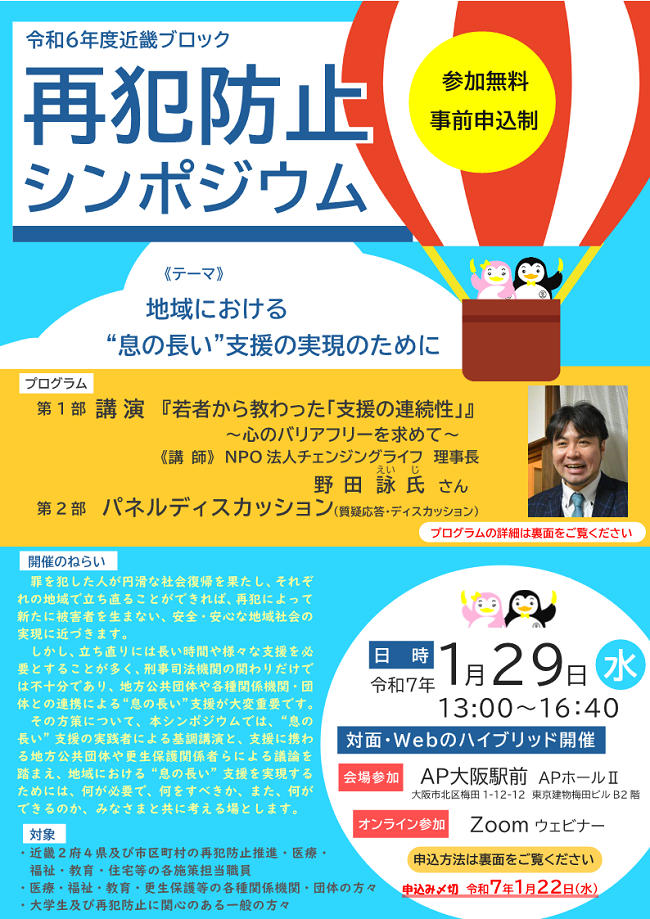令和6年度近畿ブロック再犯防止シンポジウム「地域における”息の長い”支援の実現のために」が開催されます。