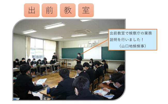 山口地方検察庁においては、検察庁の役割や業務内容などについて知っていただくため、学生の方や一般の方を対象に「出前教室」、「移動教室」の広報を実施しています。